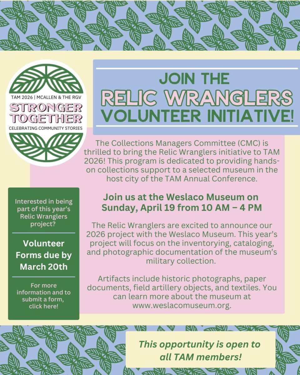 The Texas Association of Museums’ Collections Managers Committee (CMC) is bringing the Relic Wranglers initiative back to TAM 2026. The Relic Wranglers program is designed to provide hands-on collections support to a selected museum in the host city of the TAM Annual Conference.
